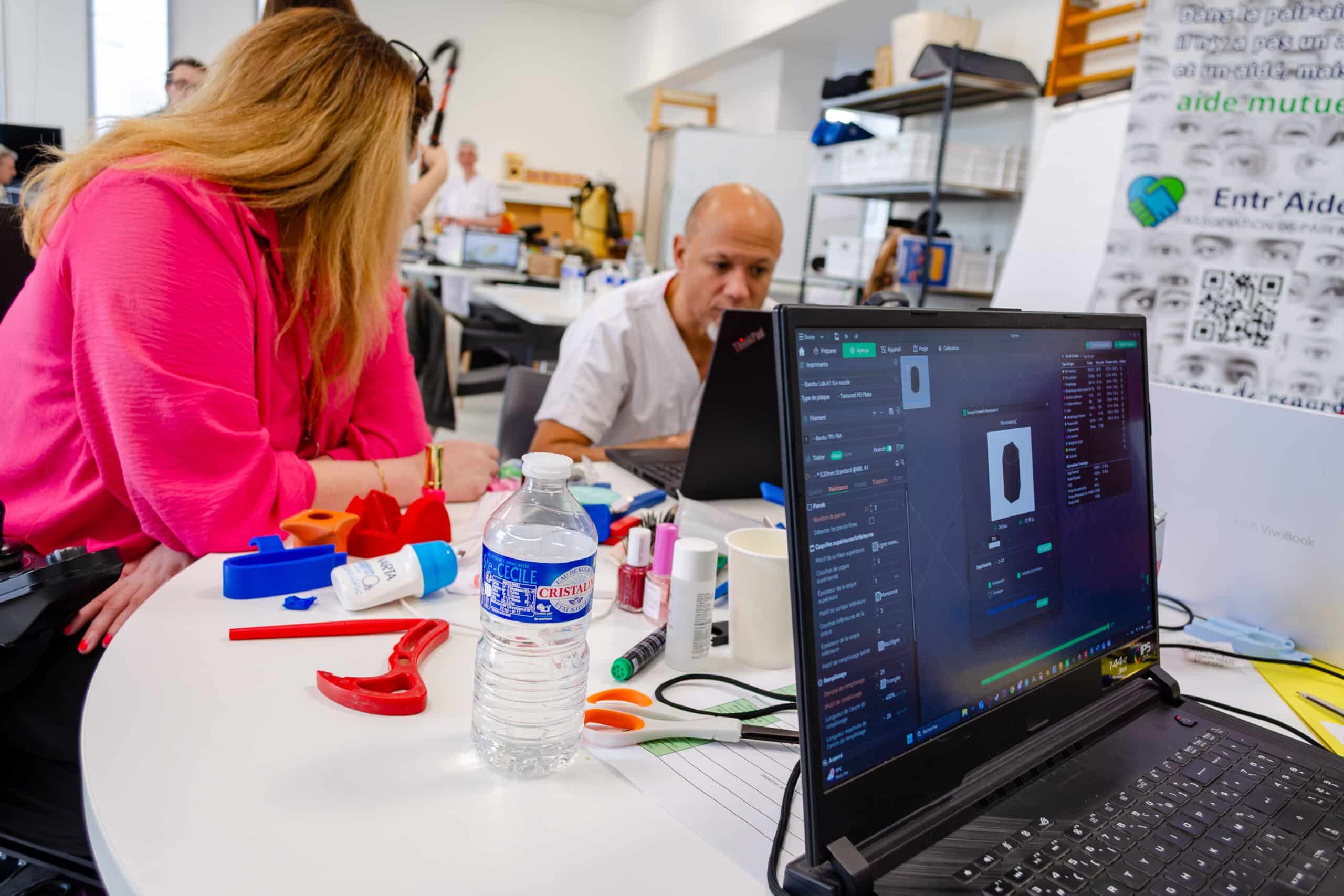 L’objectif de cet hackathon était clair : répondre aux problématiques réelles des patients grâce à l’ingéniosité collective. L’événement a rassemblé une diversité de participants : personnes en situation de handicap, professionnels de santé (ergothérapeutes, kinésithérapeutes…), et experts en conception et fabrication numérique issus de la communauté des makers. Ensemble, ils ont formé des équipes complémentaires où chaque besoin exprimé trouvait une réponse technique adaptée.